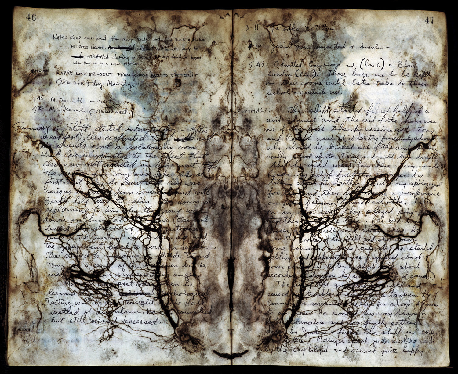 If the motion of the film can't be expressed by a still, neither can these scrawls be seen by an audience watching the mold patterns evolve as pages turn from front cover to back. Yet a viewer can get a sense of some of the concerns written about in the ledger even if the origin of the artifact is unknown (as it was to me when I saw it). Not only because the stains resemble Rorschach blots throbbing with an uncanny lifeforce (the magic of animation), but also because of the way Sansing has photographed them, as if a historical document under glass and illuminated by an archival-quality light source. Meaning is imbued into these images by their very presentation, and only amplified if we know their original provenance.