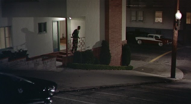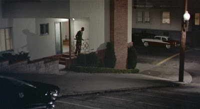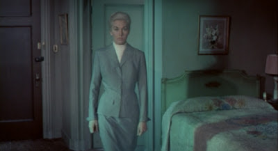WHAT: In the moment from Vertigo frame-frozen above (though better discerned when in motion), Kim Novak casts two separate shadows on the bed in her Empire Hotel apartment. As B. Kite writes in the script of his video collaboration with Alexander Points-Zollo entitled The Vertigo Variations, Novak "steps out of the bathroom into a lime-green sea spray of light; a little intimation of eternity inducted through a neon sign." This scene that plays a crucial role in practically every analysis of Vertigo from Chris Marker's to Roger Ebert's to Kite's. But I've yet to come across a reading or review that mentions the twin shadows, despite their resonance with the themes of the film, the character, the scene.... These shadows are not simply Novak's of course; they are also Judy's and Madeline's and perhaps even Carlotta's.